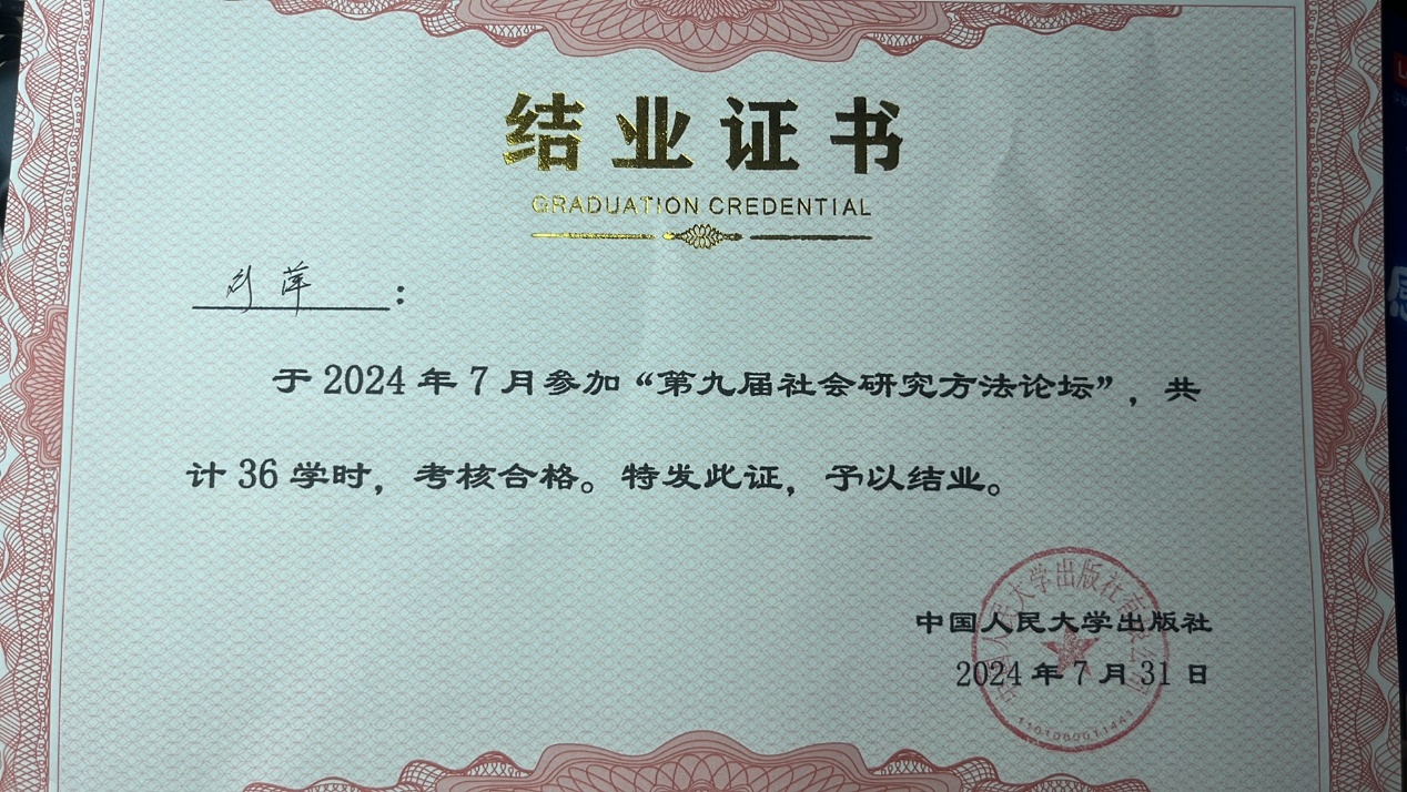 2024年7月28日至8月1日,中国人民大学出版社邀请国内社会研究方法领域的知名专家、学者,于贵州省贵阳市举办了“第九届社会研究方法论坛”。本次论坛共有来自全国来自28个省市,134所院校的240位老师和学生参加,其中线上参会72人。ag百家乐试玩公共管理系刘萍老师全程参加了此次会议,积极参与互动,并获得了本次论坛的结业证书。社会研究方法作为发现社会、探究社会的利器,是社会科学研究的重要工具。国内高校 和科研机构对社会研究方法愈发依赖,尤其在新一代信息技术、人工智能快速发展的背景下, 如何面向新情况更好地开展社会研究,更成为广大科研工作者的重要关切。秉承“服务高等 教育事业,服务一线任课教师”的宗旨,为了进一步促进对社会研究方法的交流和研讨,提 升研究者运用社会研究方法的能力与技巧,人大出版社组织了此次论坛。本次会议议程及主讲人情况介绍如下: