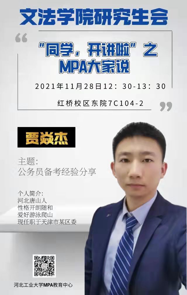 2021年11月28日中午12:30,ag百家乐试玩 研究生会MPA大家说第一期,在红桥校区7C104-2顺利举行。本期主讲嘉宾的是MPA212班的贾焱杰同学。活动伊始,MPA中心招生总监张明展老师介绍了MPA大家说的策划缘由、活动目标及未来规划,希望本系列活动能为同学们提供一个新平台,帮助大家互动交流,了解各行各业,提升自我。