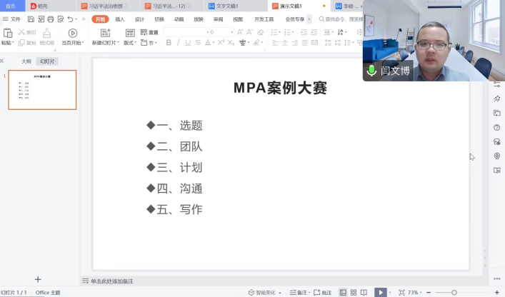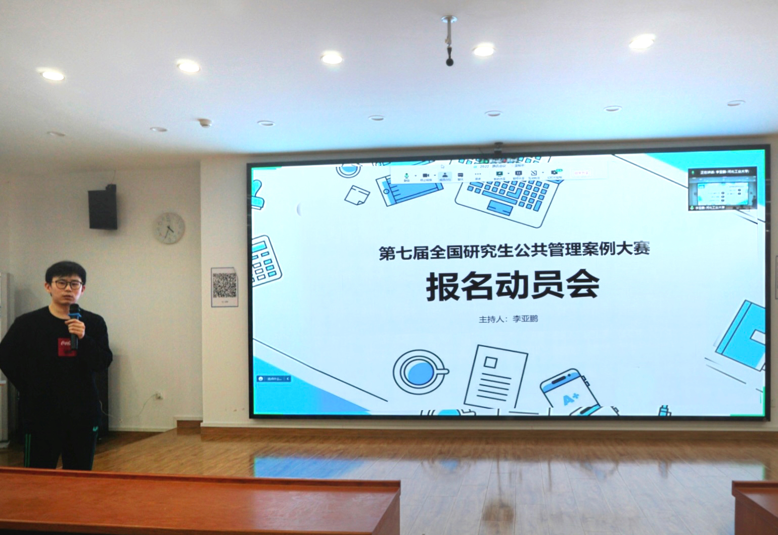秋风习习,天朗气清。2022年11月15日16点30分,第七届全国研究生公共管理案例大赛报名动员会在MPA教育中心顺利举行。本次会议由MPA中心副主任李亚鹏老师主持,ag百家乐试玩 闫文博副院长、ag百家乐试玩 陈晓春副教授、MPA教育中心招生总监张明展老师、MPA2021级和MPA2022级全体同学参加了本次会议。
