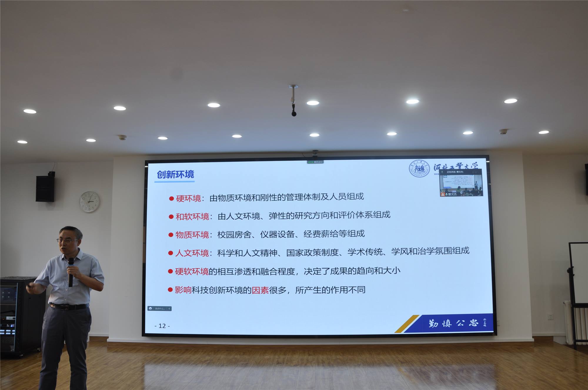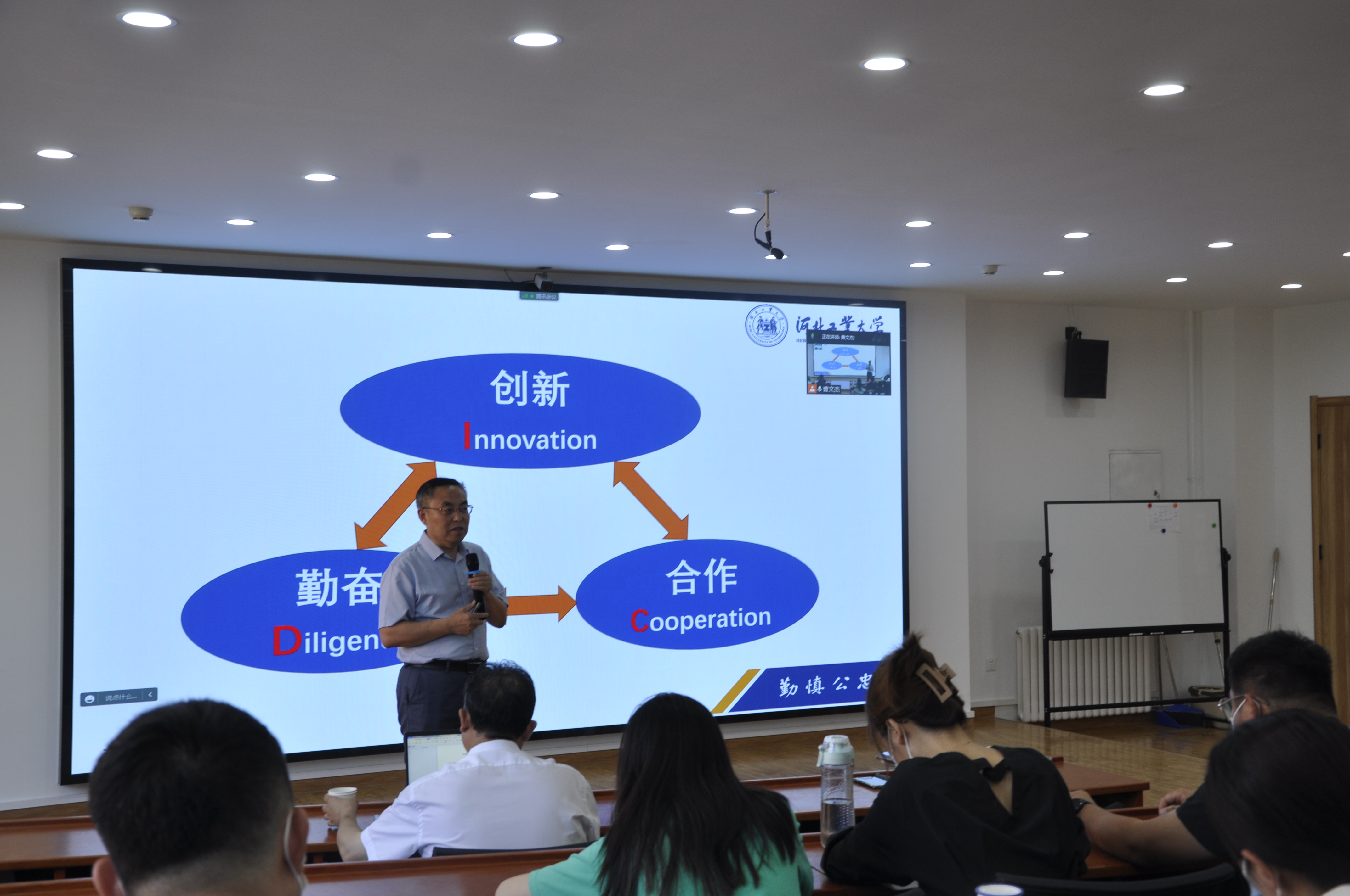 接着,马教授介绍了习近平总书记关于科技创新的重要论述,分享了河北省省委书记倪岳峰书记关于科技创新工作的文章,突出强调了科技创新对于国家发展的重要性,并阐明了我国科技创新的优势。对研究生来说,创新能力的培养为第一要务,要做出独具特色的创新项目,争做科技创新的排头兵。不论是学校还是个人,都应该将科技创新视为核心发展动力,不断提高核心竞争力。随后,马教授还就科研创新团队、项目、奖项等方面介绍了我校科研创新现状,使同学们深入了解了我校的创新成果情况,激发了学生们勇于创新的决心。