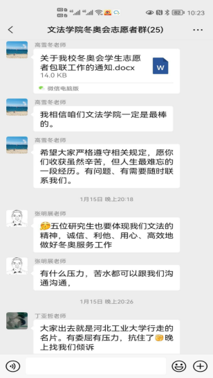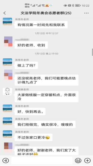 上一周,在ag百家乐试玩 老师的引导与带领下,所有ag百家乐试玩 的冬奥志愿者们有序、顺利地完成了三轮核酸检测。核酸检测期间,ag百家乐试玩 领导及辅导员老师们也对志愿者们的疫情防护与自身安全方面再三关怀,切实保障志愿者们的健康状况。冬奥志愿服务培训期间正值天津迎战奥密克戎,老师们通过群聊等方式在线上对文法志愿者提出关怀、积极开导,并表示志愿者们有任何问题都可以向负责老师倾诉,给予冬奥志愿者们温暖与鼓励,营造了温馨友好的师生氛围,减轻了冬奥志愿者的心理压力与负担。