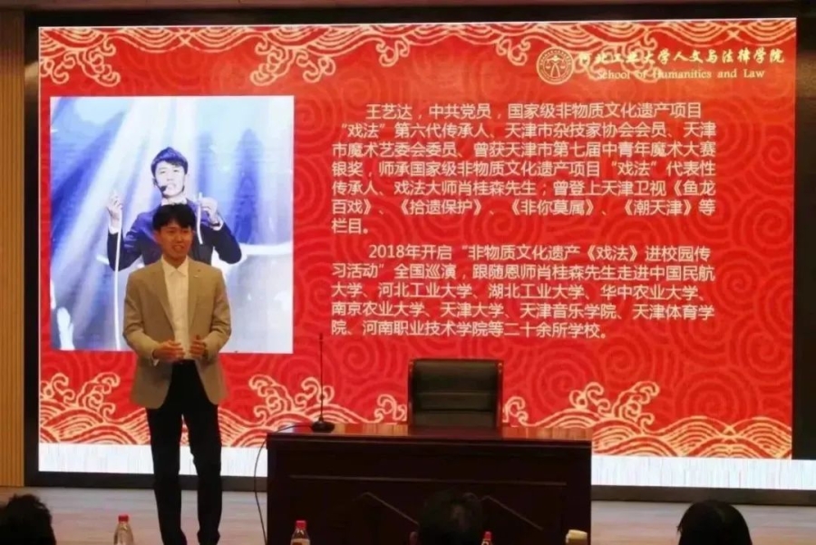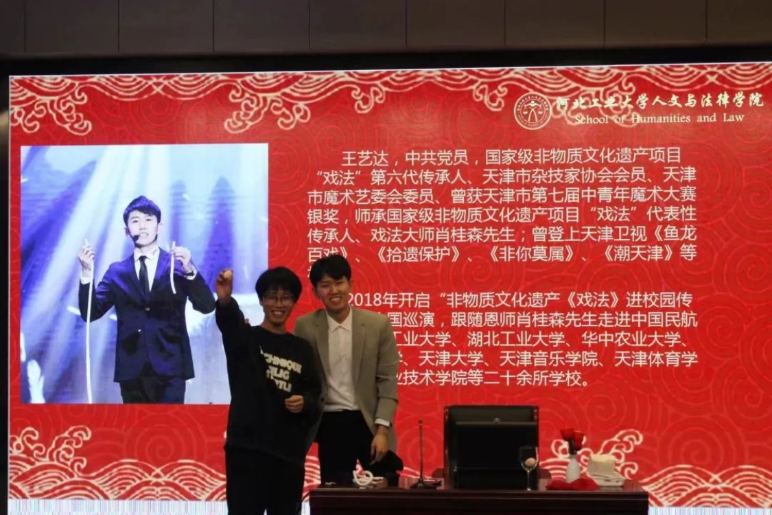 为使同学们深入了解古彩戏法的艺术魅力,认识到肩上所担负的传承非遗、延续传统文化的重任,增强我们的文化自信,在推动时代进步的同时让千年的中华文明经久不息、源远流长,ag百家乐试玩入口 中文系邀请到了国家级非物质文化遗产项目“戏法”第六代传承人、天津市杂技家协会会员、天津市魔术艺委会委员王艺达,于3月24日下午2点在河北工业大学红桥校区东院7D101为大家讲解戏法的历史起源、戏法的传承与发展现状、戏法与魔术的区别等古戏法相关的知识。
