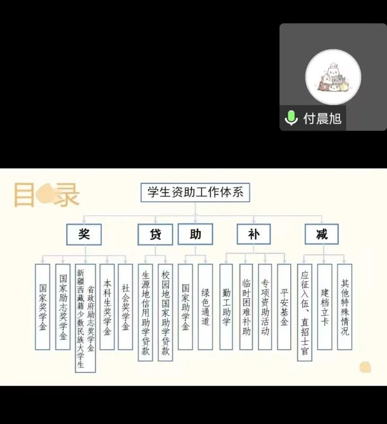 付晨旭同学从“奖”、“贷”、“助”、“补”和“减”五个方面具体阐释了学校学生资助工作体系的内容。其中,“奖”包括国家奖学金、国家励志奖学金、新疆西藏籍少数民族大学生省政府励志奖学金、本科生奖学金;“贷”包括校园地国家助学贷款和生源地信用助学贷款;“助”包括绿色通道和国家助学金;“补”包括勤工助学、临时困难补助、专项资助活动和平安基金;“减”包括应征入伍、直招士官、建档立卡和其他特殊情况。