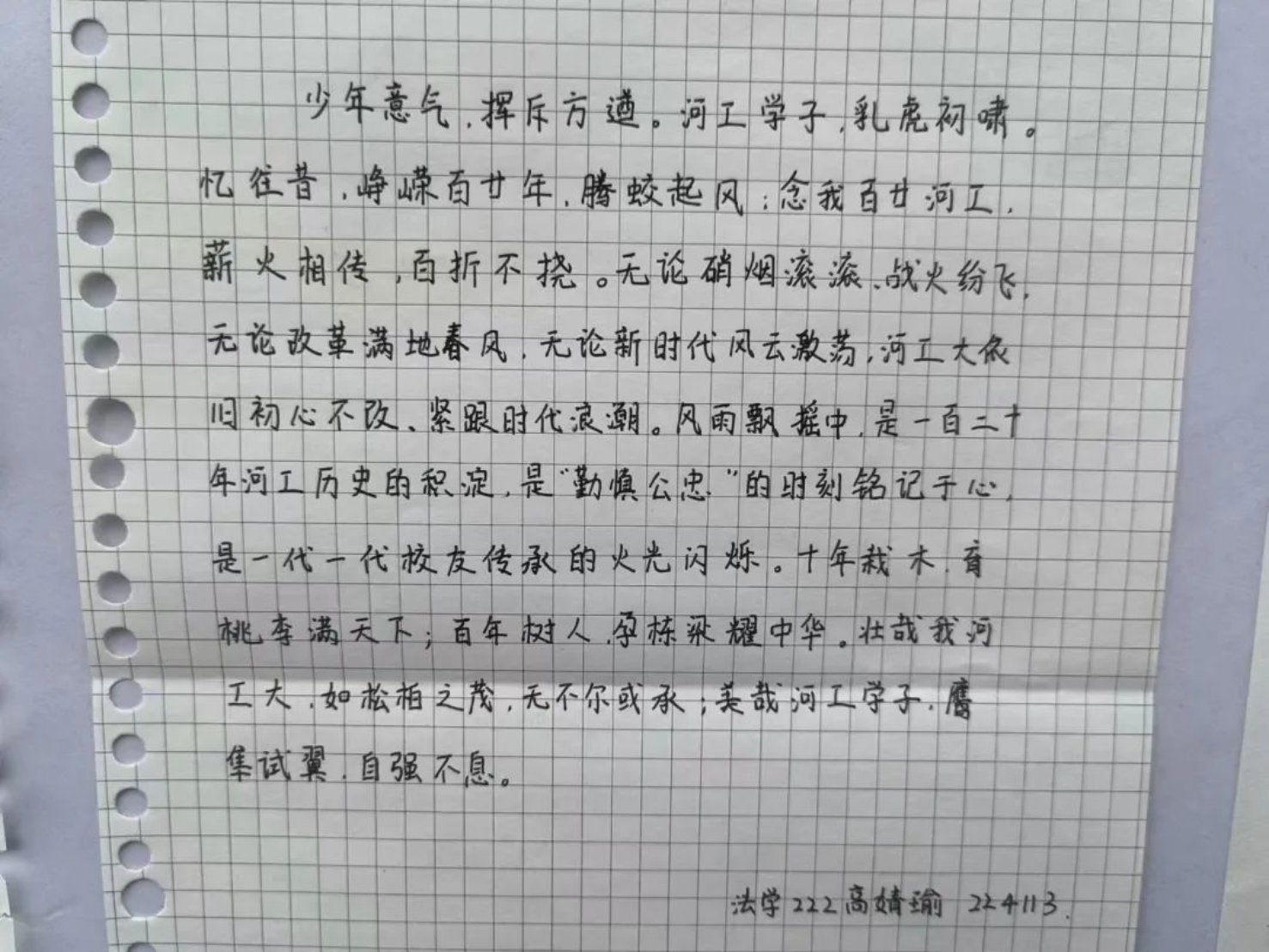 众志成城,豪情万丈,河工气象,御风腾翔;立德树人,胸怀天下,长风破浪,奋发昂扬。回首往日,每一分尽是“青春记忆”;翘望未来,每一秒满是“青春梦想”。百廿盛典,嘉期是会,共话未来梦想;河工精神,薪火相传,同擘蓝图煌煌。