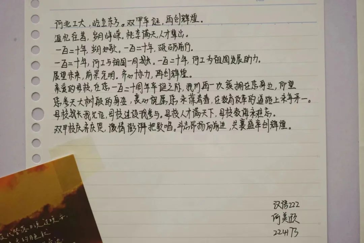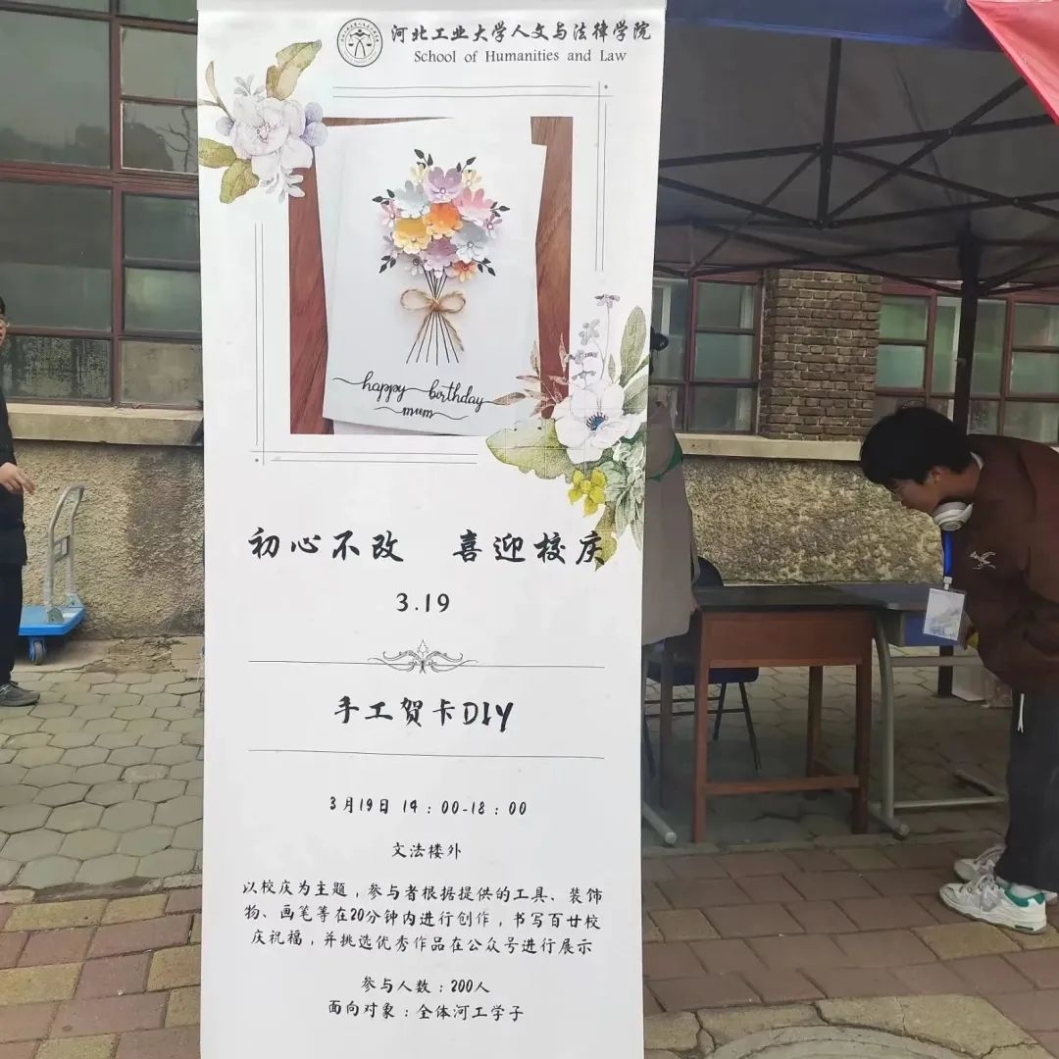 云雨浸润青城岁月,积淀下深厚底蕴;风霜打造今日辉煌,唱响出精彩华章。年轮转过,你成就了我,我延续了你。大家都有着独属于自己的河工大记忆,都有着对母校最真挚热烈的感情。一张张DIY贺卡,倾诉了大家内心对母校的万千情谊,为学校百甘献上这份珍贵的贺礼。活动现场上挤满了人群,同学们排起了队伍,都想通过贺卡送上自己的祝福。一张张小小的贺卡,承载着我们对母校深深的爱意。
