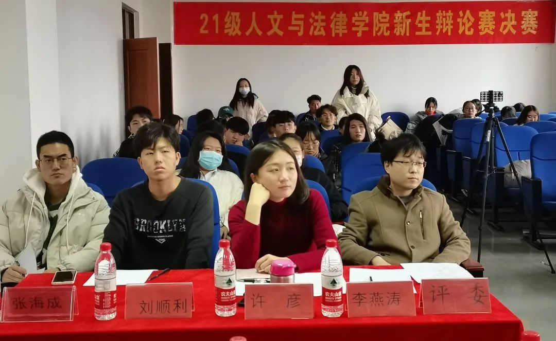 评委团成员有:21级校辩论队队长、20级文法求知辩论队队长李贡萌,20级文法求知辩论队队长刘顺利、杨婧哲, 21级校辩论队队长、19级文法求知辩论队优秀辩手刘苗,19级文法求知辩论队优秀辩手张海成。