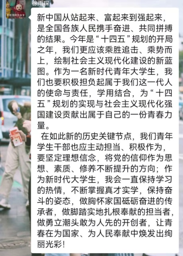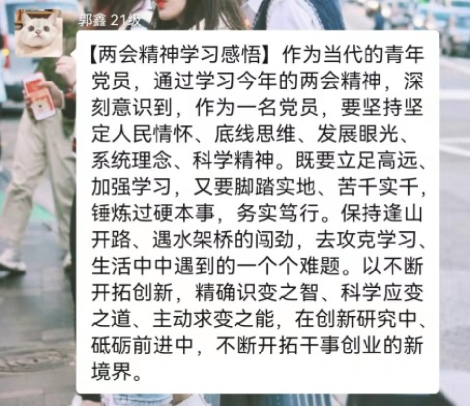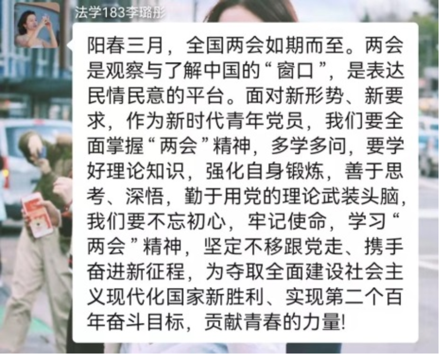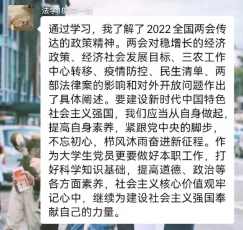 十三届全国人大五次会议与全国政协十三届五次会议分别于2022年3月5日-3月11日与2022年3月4日-3月10日在北京召开。法学专业学生第二党支部的32位成员紧跟思想潮流,积极进行理论学习,并在学习两会思想后纷纷在群里发表了自己的看法。
