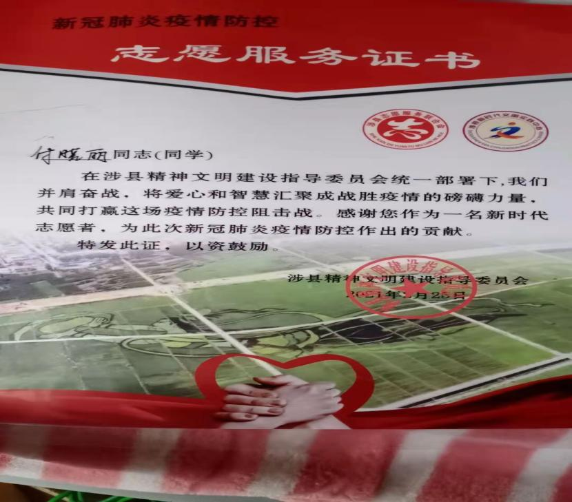 汉语181班王淑洁同学,于2021年1月到2月,积极主动地参加邯郸市涉县疫情防控志愿服务活动,荣获志愿服务荣誉证书。