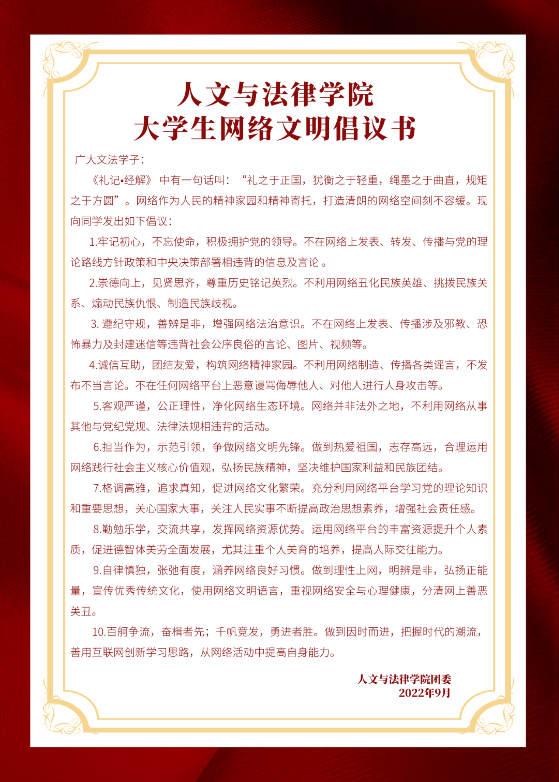 ag百家乐试玩 学工办主任兼团委书记高雪冬发出“清朗网络,文化育人”的网络文明倡议,号召大家要遵守网络法律法规,弘扬遵纪守法正能量正能,自觉维护好网络安全。