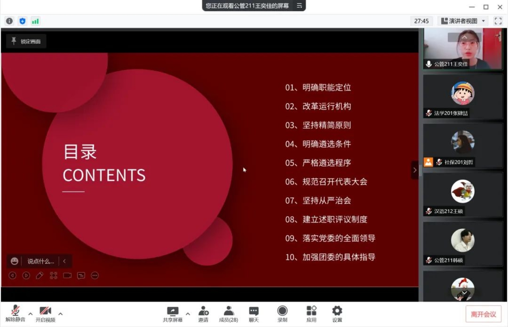 校友与对外联络就业部的王奕佳同学以PPT的形式对高校学生会改革的十项改革举措进行了生动讲解。明确职能定位、改革运行机构、坚持精简原则、明确遴选条件、严格遴选程序、规范召开代表大会、坚持从严治会、建立述职评议制度、落实党委的全面领导、加强团委的具体指导,十项改革举措由小到大、由浅入深,为学生会的未来发展指明了道路。最后,王奕佳同学引用习近平总书记回信中的话作为结尾,希望学生会工作人员都能珍惜韶华、奋发有为,为实现中国梦奉献智慧和力量。