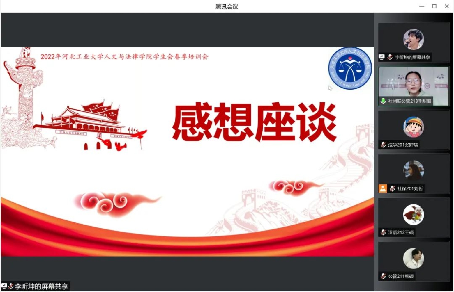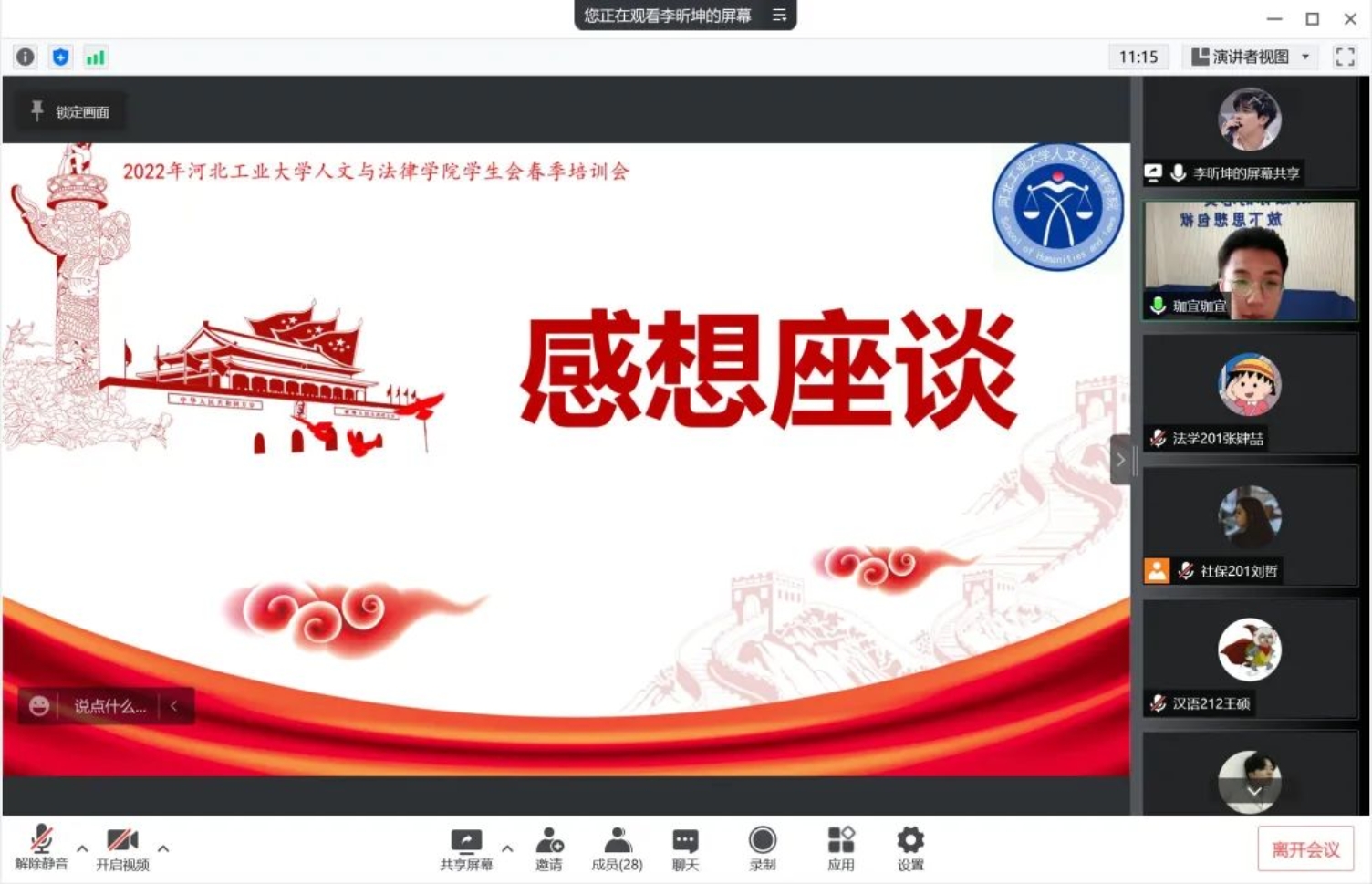 本次会议由第二课堂生活权益部部长李昕坤担任主持,白星媛、刘苗两位主席以及办公室、第二课堂生活权益部、社团联合部、校友与对外联络就业部四个部门的部长和部员共同参与。