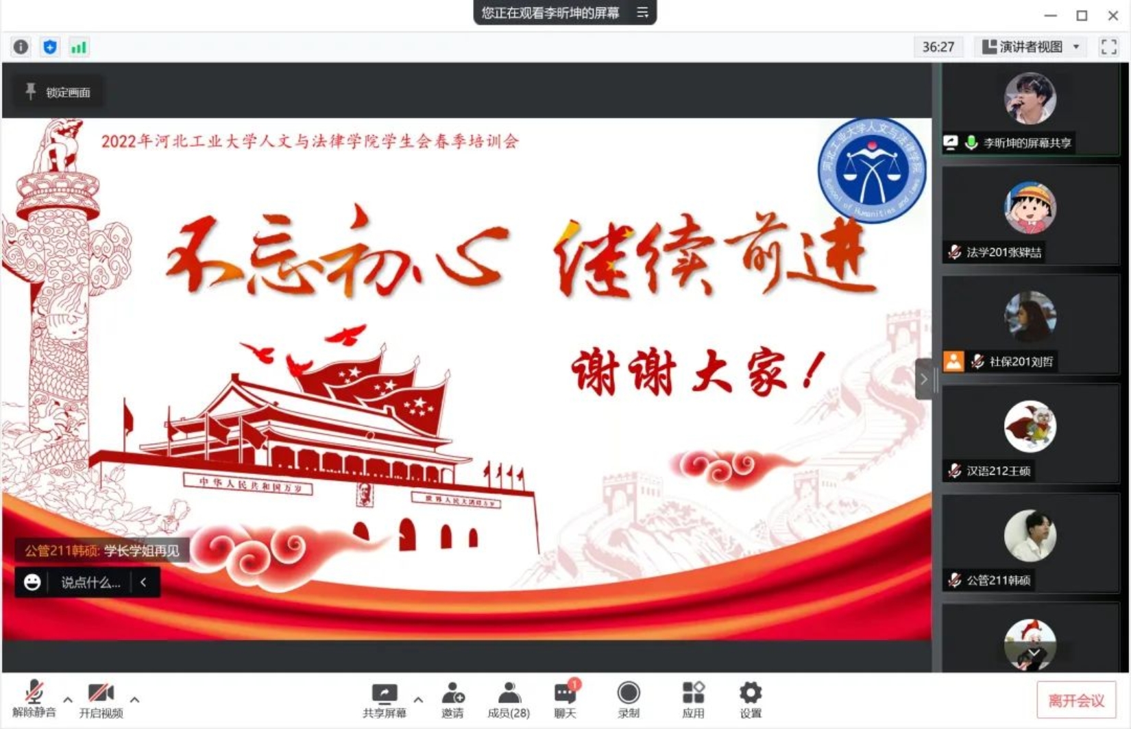 本次春季培训会就此落幕,我们将在今后的工作中践行本次会议精神。希望学生会全体成员都能够严格要求自己,共同建设一支让党放心、师生满意、社会认可、朝气蓬勃的学生队伍,也祝愿ag百家乐试玩 学生会越来越好、日胜一日!