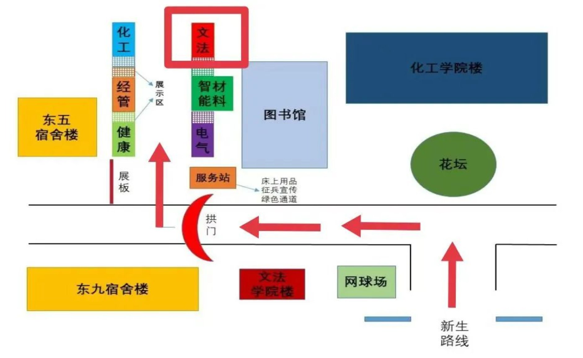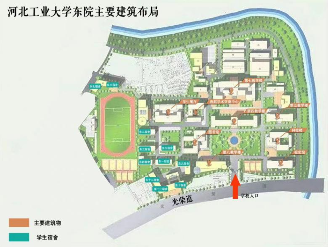 新生们进入东院校门口后,向左方向拐弯直走便可看到图书馆,随后到达位于图书馆西侧的报道点。新生女生宿舍是东二宿舍,新生男生宿舍是东三宿舍。报到路线图和河北工业大学东院主要建筑布局图如下所示