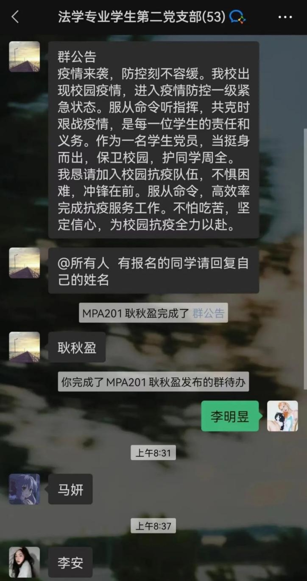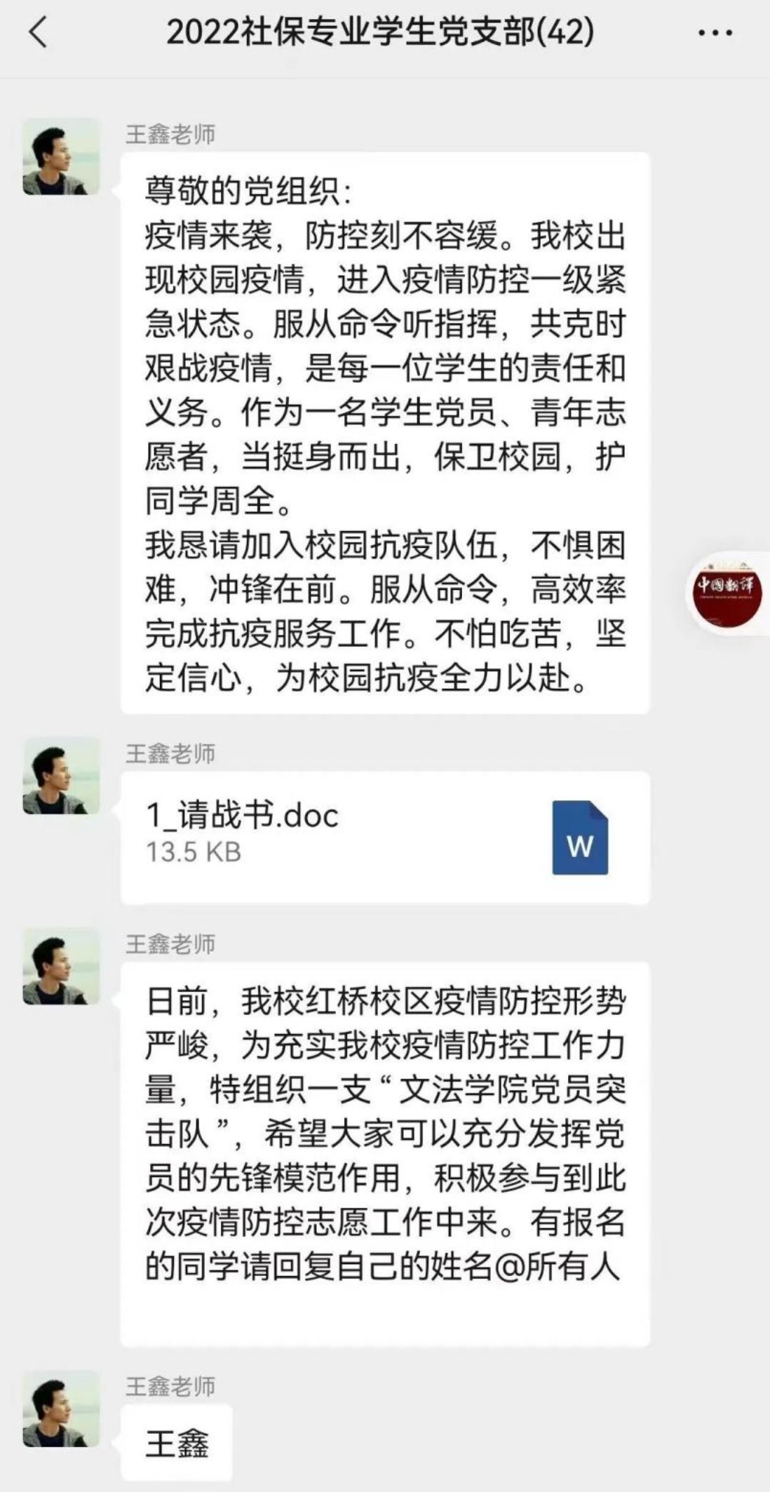 青春向阳,璀璨如歌。在这期间,有这样一群可爱的学生,义无反顾地“出手”。他们勇敢坚毅,始终青春洋溢、乐观向上;他们整装待发,愿意“有一份热,发一份光”;他们逆风而上,在志愿前线积极配合,坚韧不拔。他们就是ag百家乐试玩 党员志愿者突击队和青年志愿者突击队的学生们。截至目前,ag百家乐试玩已有70名在校学生党员主动报名,358名青年学生积极参与志愿活动。