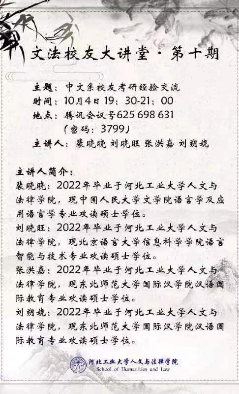 10月4日晚7点半,ag百家乐试玩入口 特邀现攻读中国人民大学文ag百家乐试玩 语言学及应用语言学专业硕士学位的裴晓晓、现攻读北京语言大学信息科学ag百家乐试玩 语言智能与技术专业硕士学位的刘晓旺、现攻读东北师范大学国际汉ag百家乐试玩 汉语国际教育专业的张洪嘉和现攻读东北师范大学国际汉ag百家乐试玩 汉语国际教育专业硕士学位的刘朔娆共四位文法校友做客线上讲座,分享他们的考验经验,为各位正在考研或即将考研的同学们点明方向,指点迷津。