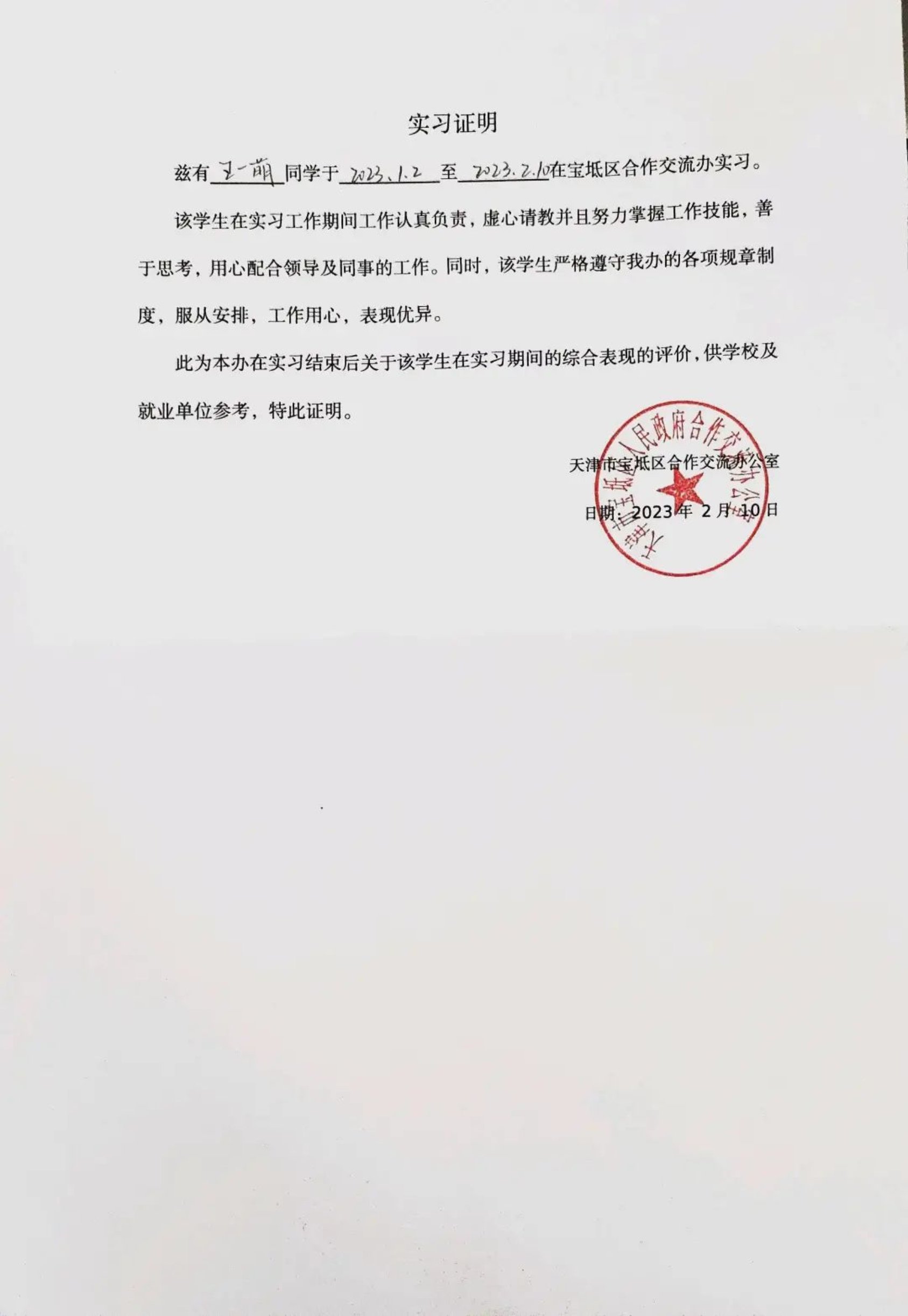 2022年寒假天津市大学生实习“扬帆计划”政务专项工作在各团区委、各高校团委、各用人单位和实习生的共同努力下圆满结束。经过各单位组织申报、考察审核等环节,ag百家乐试玩法学204班学生王一萌同学荣获“优秀实习生”称号。