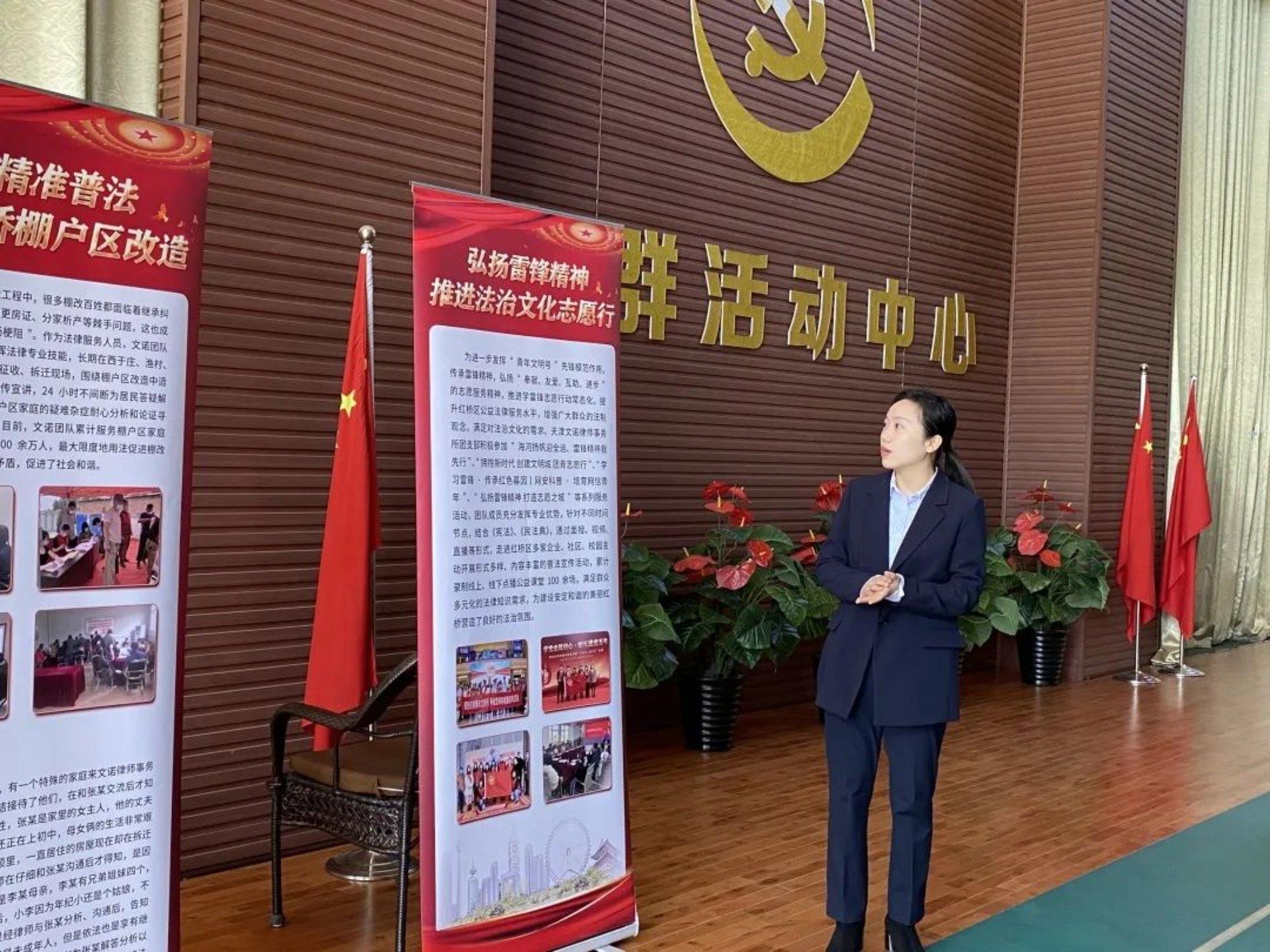 接着,刘婷婷律师带领大家来到党群活动中心。弘扬雷锋精神,开展精准普法,组织模拟法庭活动,助力脱贫攻坚,文诺律师事务所在多方面践行社会责任,提高社会价值。刘婷婷律师通过讲述实际案例,让同学们走进法律,走进现实。
