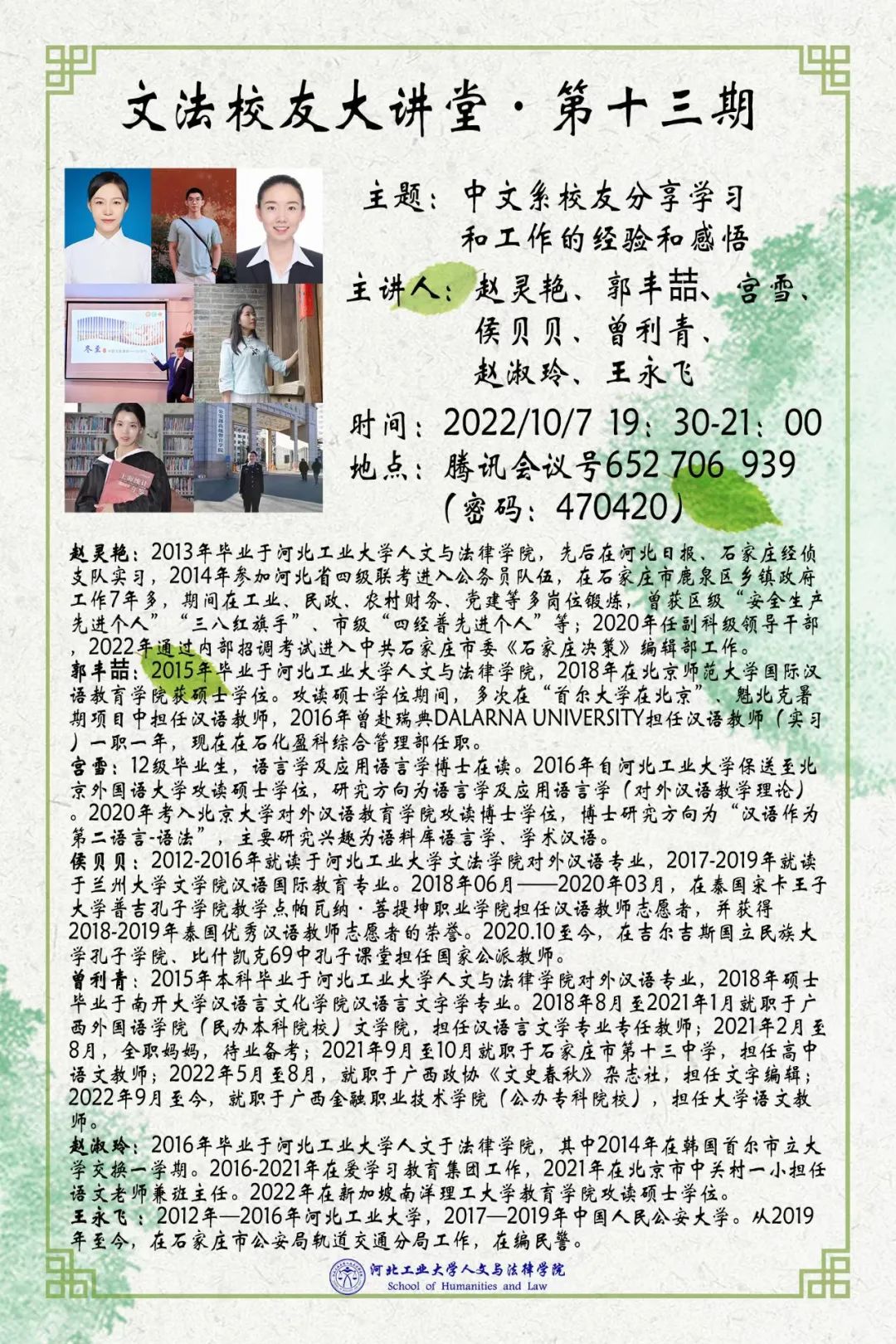 10月7日晚7点半,ag百家乐试玩入口 特邀中共石家庄市委《石家庄决策》编辑部部员赵灵艳、石化盈科综合管理部部员郭丰喆、大学语文教师曾利青、孔子ag百家乐试玩 国家公派教师侯贝贝、北京大学语言学在读博士宫雪、新加坡南洋理工大学教育学在读硕士赵淑玲、石家庄轨道交通分局民警王永飞等校友做客线上讲座,为同学们分享他们在学习和工作中的经验与感悟,提供更多可行性建议。