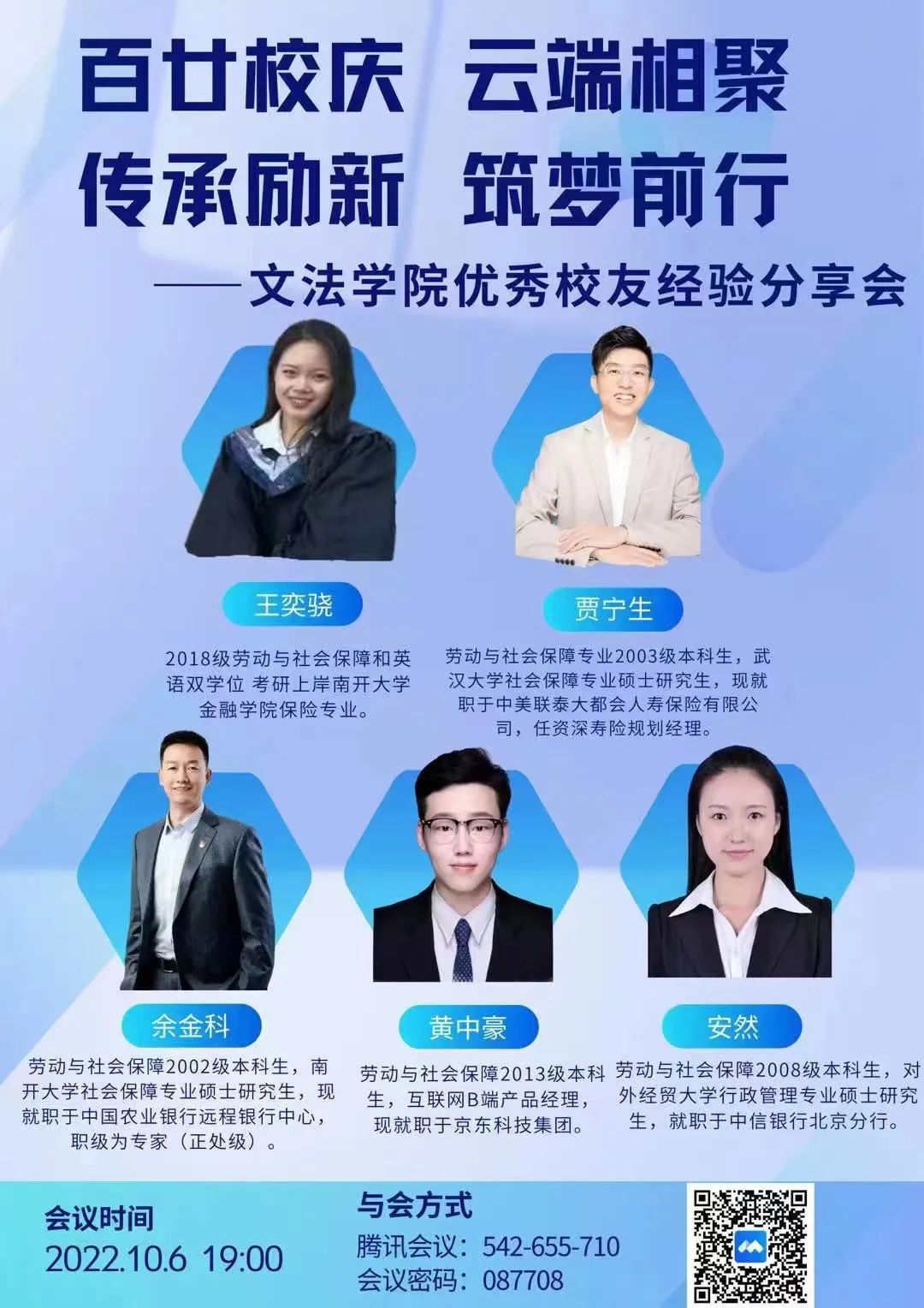 10月6日晚7点,ag百家乐试玩入口 特邀考研上岸南开大学金融ag百家乐试玩 保险专业的王奕骁、现就职于中美联泰大都会人寿保险有限公司的贾宁生、现就职于中国农业银行远程银行中心的余金科、现就职于京东科技集团的黄中豪和现就职于中信银行北京分行的安然这六位优秀校友分享自己的经验。ag百家乐试玩 党委书记白彦刚、院长李艳双、副院长马立民和闫文博及ag百家乐试玩多名教师和社保本科学生参加此次讲座。