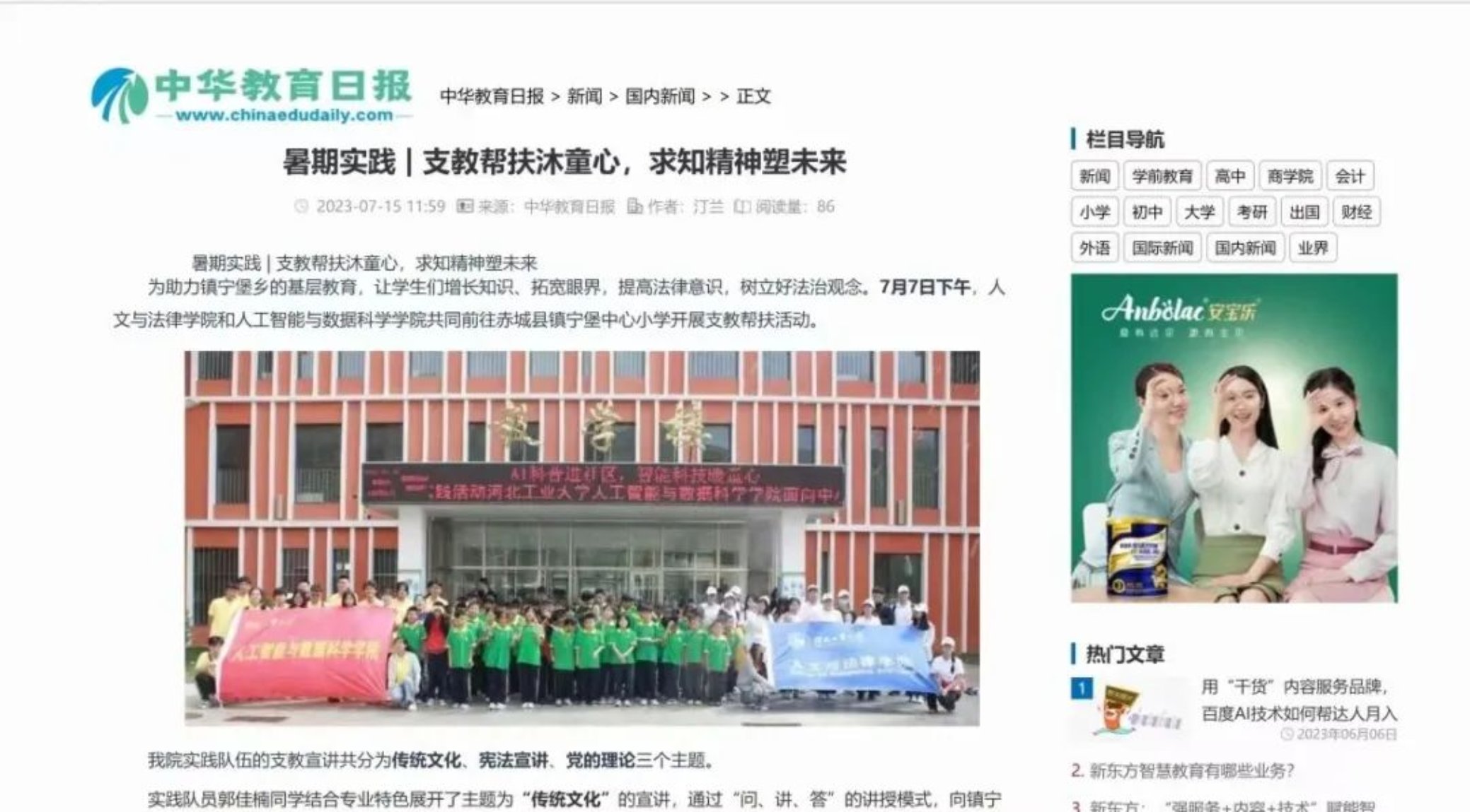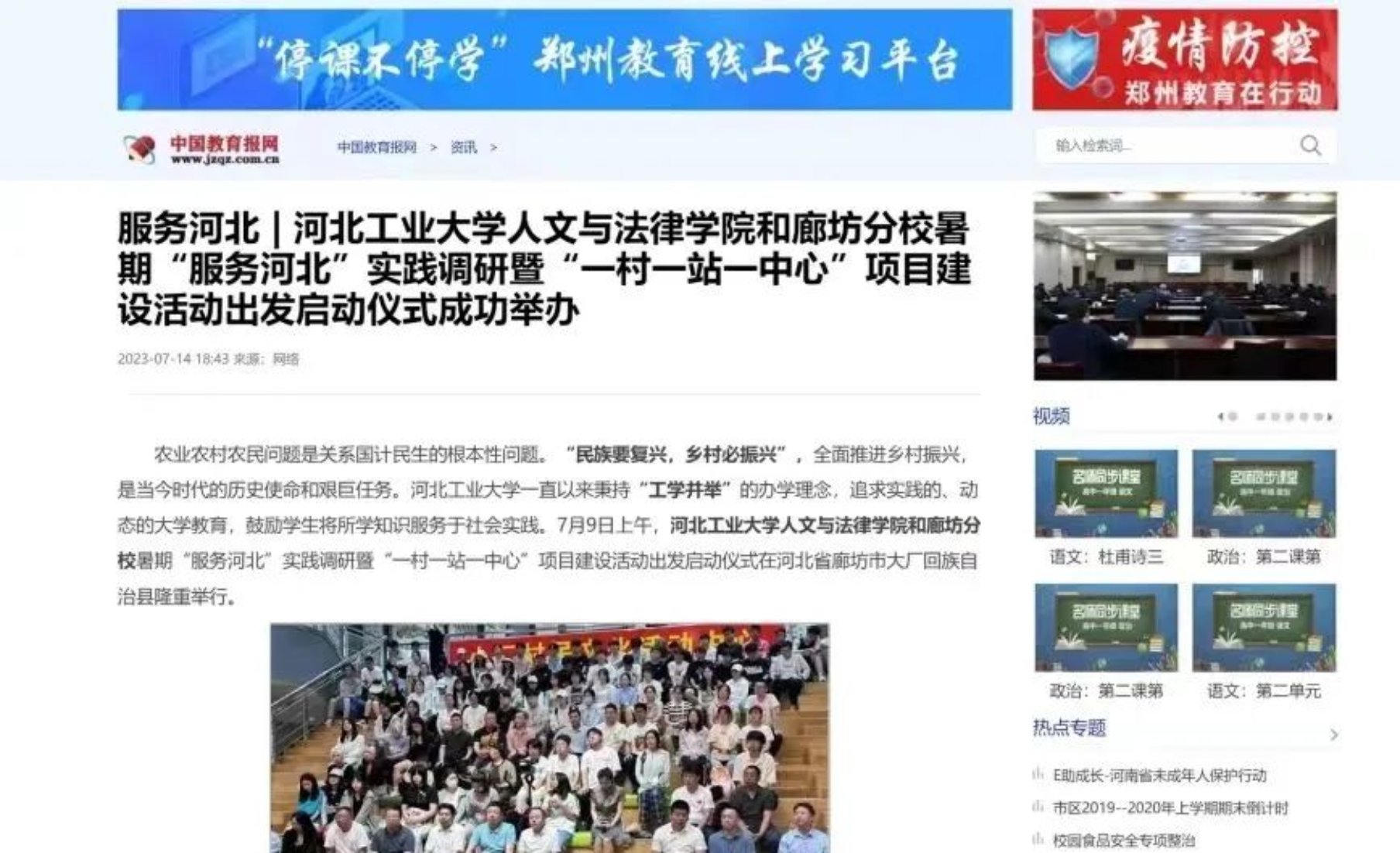 谱绘青春图景,奏响实践赞歌,暑期社会实践进行的同时,ag百家乐试玩与廊坊分校暑期“服务河北”实践调研暨“一村一站一中心”项目获得了中国教育电视台、中国教育报、河北新闻网、冀云等多家国家级、省级媒体报道。另外,中国青年报、中国教育报网、中国教育周刊、中国教育报道、中华教育日报、中华学习网等媒体平台也对ag百家乐试玩暑期社会实践相关的19篇优秀稿件进行刊登宣传。