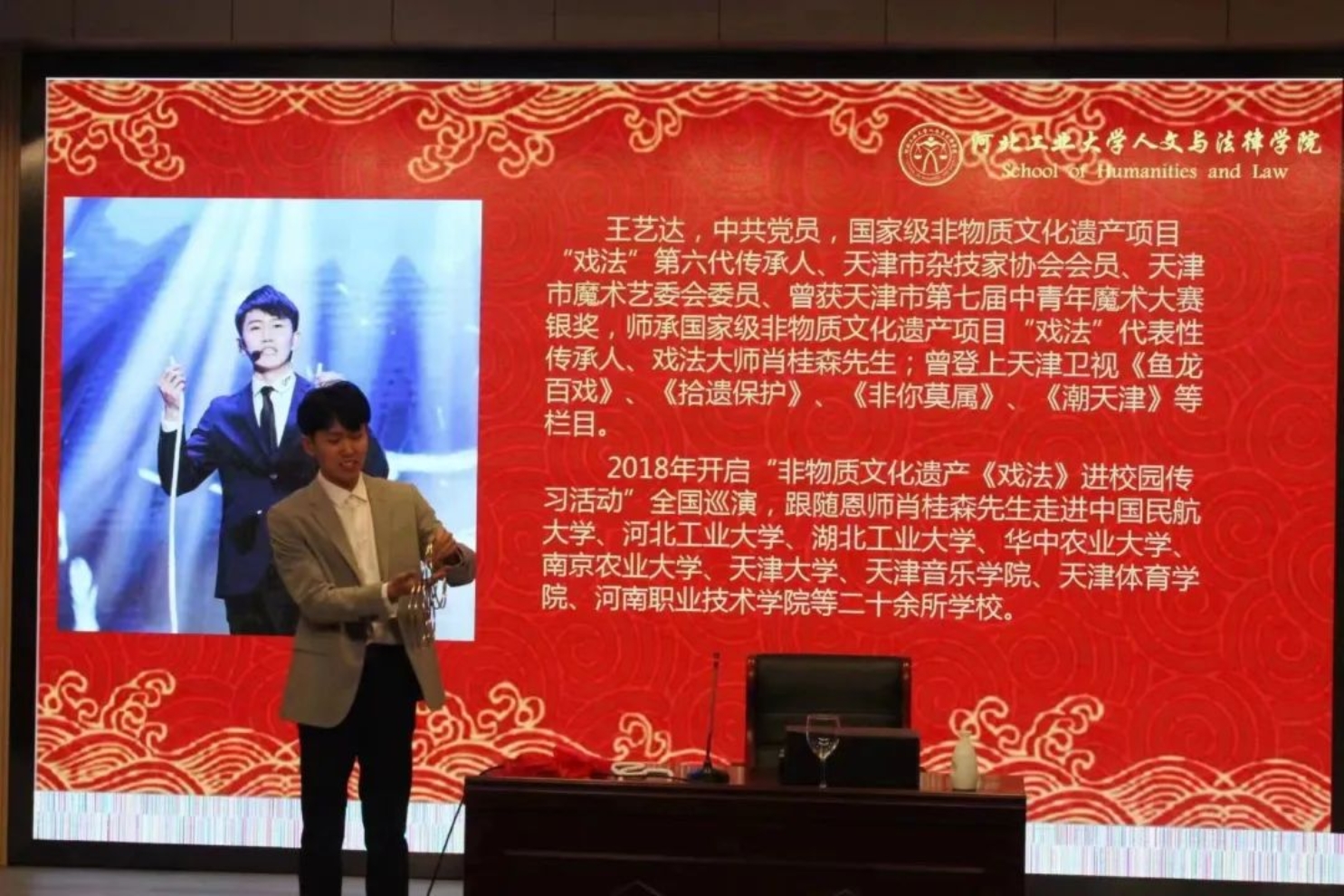 为使同学们深入了解古彩戏法的艺术魅力,认识到肩上所担负的传承非遗、延续传统文化的重任,增强我们的文化自信,在推动时代进步的同时让千年的中华文明经久不息、源远流长,ag百家乐试玩入口 中文系邀请到了国家级非物质文化遗产项目“戏法”第六代传承人、天津市杂技家协会会员、天津市魔术艺委会委员王艺达,于3月24日下午2点在河北工业大学红桥校区东院7D101为大家讲解戏法的历史起源、戏法的传承与发展现状、戏法与魔术的区别等古戏法相关的知识。