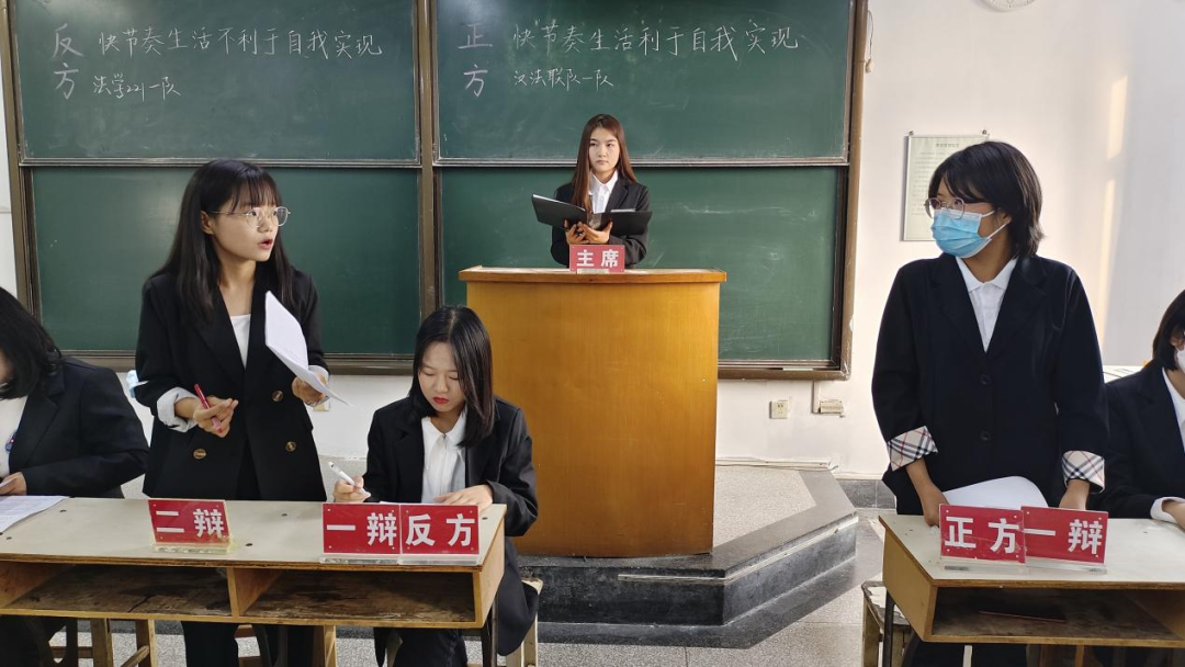 快餐备受追捧,高铁日行千里,人们步履匆匆……如今人们的生活逐渐趋向快节奏:快点娶妻生子,快点成家立业,快点买房买车……人似乎被快节奏的生活推着走,这时就会不禁想问:快节奏生活有利于自我实现吗?正反双方针对此问题展开辩论。正方认为快节奏生活不代表不休息而是代表高效利用时间,快节奏生活可以帮助人们找到目标,充分利用时间,从而得到能力的提升。反方则认为快节奏生活容易导致年轻人生理心理的“亚健康”且不利于人们沉淀自身进行深度思考,人们在快节奏生活下迷失自我导致精神上匮乏。最终正方取得胜利。反方二辩姜宁宁凭借冷静的态度、犀利的语言、突出的辩才赢得本场最佳辩手。