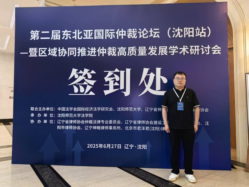 2025年6月27日,ag百家乐试玩入口 法学系教师李飞参加第二届东北亚国际仲裁论坛(沈阳站)暨区域协同推进仲裁高质量发展学术研讨会。本届论坛由中国法学会国际经济法学研究会、沈阳师范大学、辽宁省仲裁协会、辽宁省律师协会联合主办,沈阳师范大学ag百家乐试玩 承办,辽宁省律师协会仲裁法律专业委员会、辽宁省律师协会建设工程法律专业委员会、沈阳市律师协会、辽宁坤略律师事务所、北京市君泽君(沈阳)律师事务所协办。吸引了来自全国各地的仲裁领域精英、资深学者、法律从业者及企业界代表,共同探讨东北亚区域仲裁中心的建设与仲裁协同机制的创新发展路径。会上,李飞老师受聘为辽宁省法学会仲裁法研究会仲裁理论与实务创新专门委员会成员。