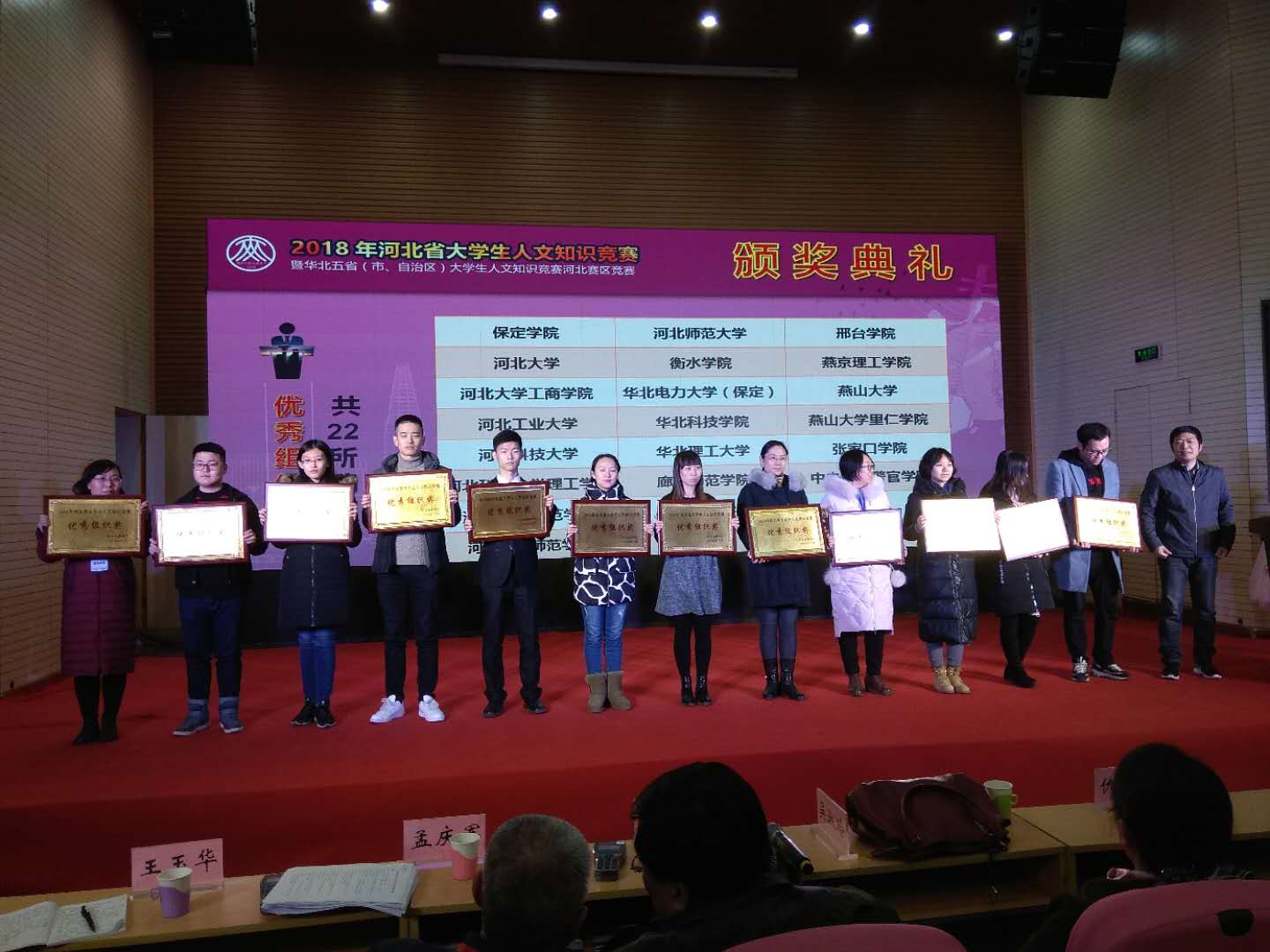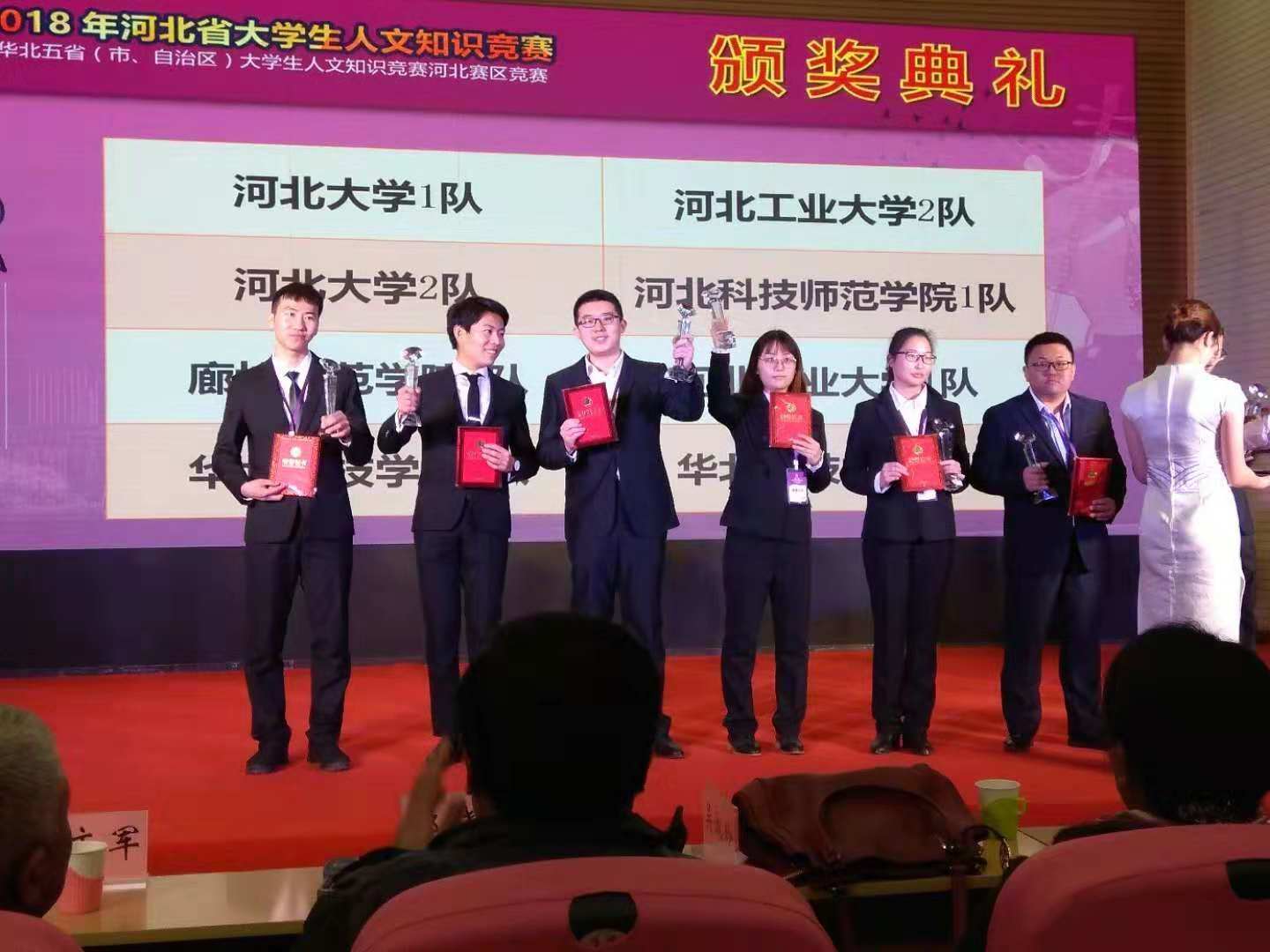 12月7日至10日,由我校ag百家乐试玩 、马克思主义ag百家乐试玩 、外国语ag百家乐试玩 十名学生组成的2支代表队赴石家庄参加河北省教育厅主办,河北师范大学承办的华北五省(市、自治区)人文知识竞赛河北省赛区比赛。经过激烈角逐,我校2支代表队均获省级一等奖,我校获得优秀组织奖,4位指导老师获得优秀指导教师。河北省教育厅高教处副调研员高明、河北师大副校长郑振峰、河北师大教务处处长郭毅等领导莅临现场观看比赛并为获奖师生颁奖。华北五省人文知识竞赛是由清华大学于2000年发起,由五省相关教育部门负责的一项重大赛事。它是跨省域的大型学科竞赛,具有广泛的影响力。河北省大学生人文知识竞赛是华北五省人文知识竞赛的省际选拔赛,是河北省教育厅努力打造的多个重要赛事之一,主要有必答题、抢答题、情景展示、即兴说理、诗歌创作以及人文演绎等形式,旨在推动我省各高校的大学文化建设,推进大学生人文素养和创新精神的养成教育,全面提升人才培养质量。各环节比赛充分展示了参赛选手广博的文化知识和深厚的文化修养,呈现了一场精彩纷呈的人文视听盛宴。本次比赛共有41所高校78支代表队参加,我校2支代表队分别以初赛第2名和第8名的好成绩进入半决赛,并均以小组第3名挺进决赛,最终双双获得省级一等奖。