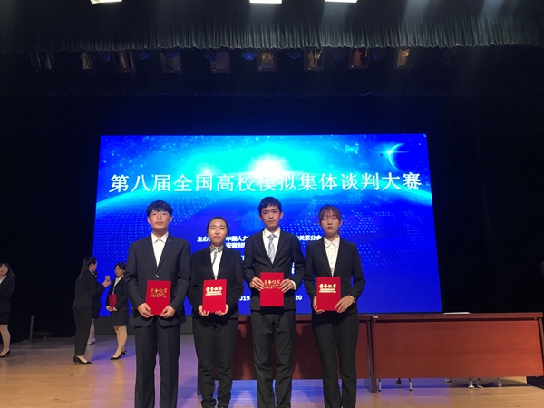 闫文博副院长带队,李晋康、周宇航、孙月、郭雅雯四名同学组成劳方代表队,张喜彪、董佳伟、杜梦真、汪伊凡四名同学组成资方代表队。在领队老师的精心指导和队员们的努力坚持下,我校资方代表队斩获全国一等奖,劳方代表队获得全国三等奖,我校被评为最佳组织奖。另外,郭雅雯同学、汪伊凡同学分别获得“最佳谈判员”称号,翟中玉、文太林老师分别获得“优秀指导老师”称号。