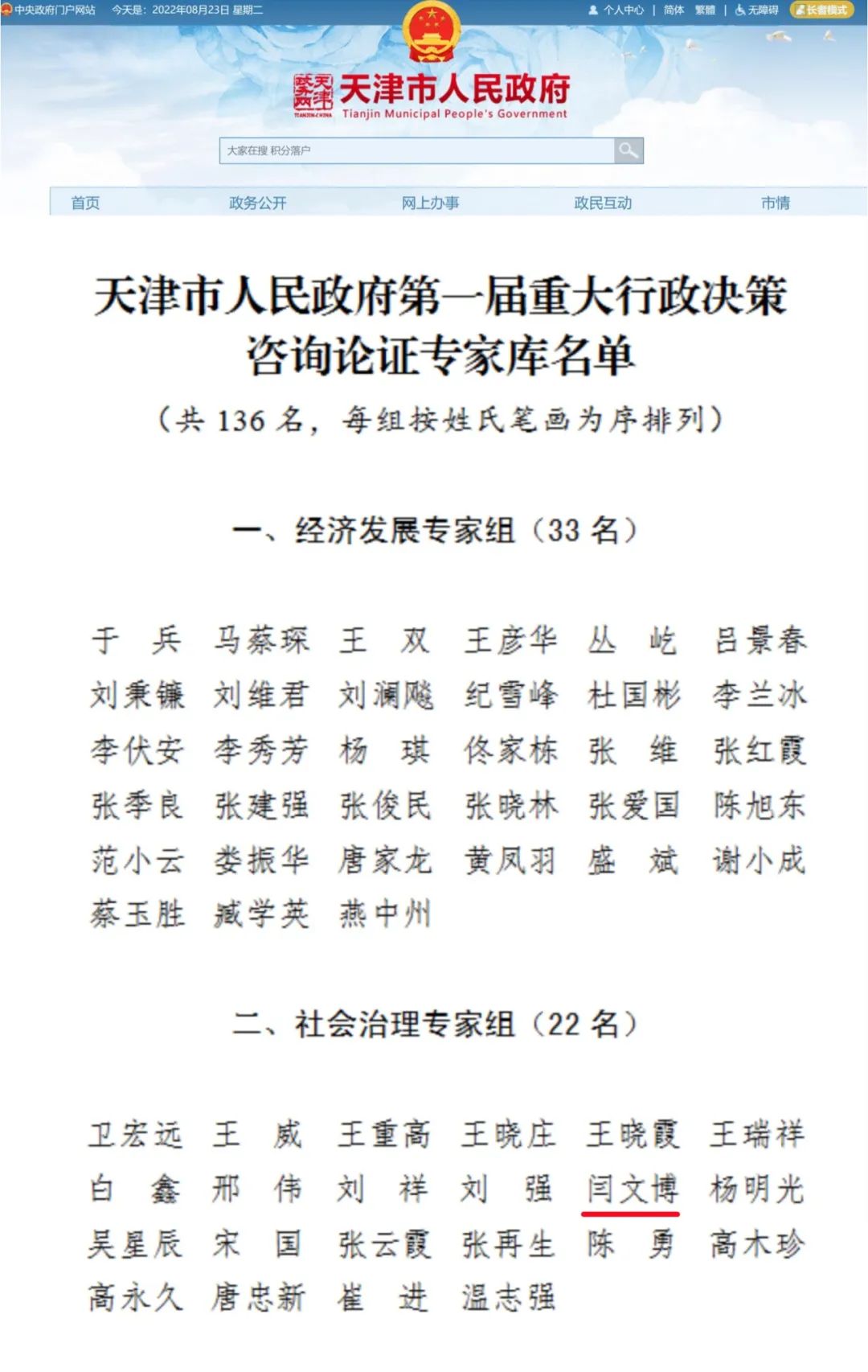 2022年8月17日,天津市人民政府发布《天津市人民政府关于第一届重大行政决策咨询论证专家库名单的公告》,ag百家乐试玩闫文博副教授入选天津市人民政府第一届重大行政决策咨询论证专家库-社会治理专家组。