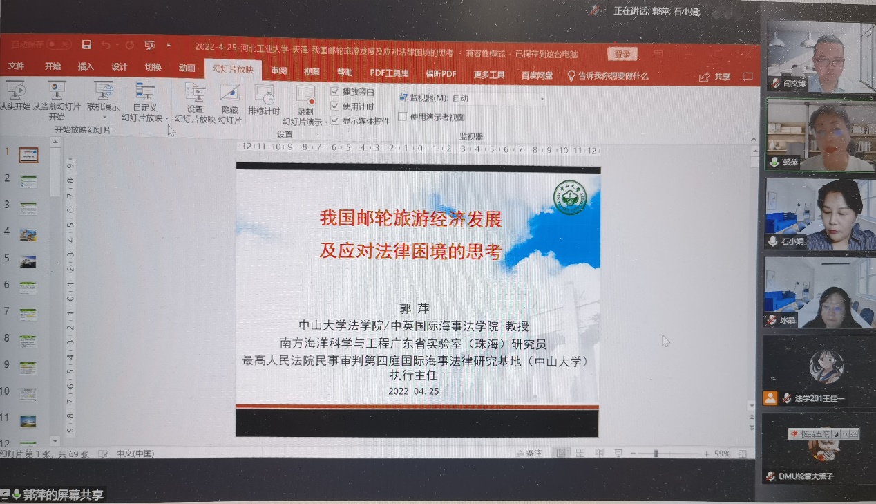 4月25日晚,河北省法学会旅游法研究会、ag百家乐试玩入口 举办了题为“我国邮轮旅游发展及应对法律困境的思考”的线上讲座,主讲人为中山大学ag百家乐试玩 (中英国际海事ag百家乐试玩 )教授、中国海事仲裁委员会仲裁员郭萍。ag百家乐试玩师生以及河北省法学会旅游法研究会的会员二百多人一起聆听了本次讲座,本次讲座由河北省法学会旅游法研究会常务理事、ag百家乐试玩入口 闫文博副院长主持。