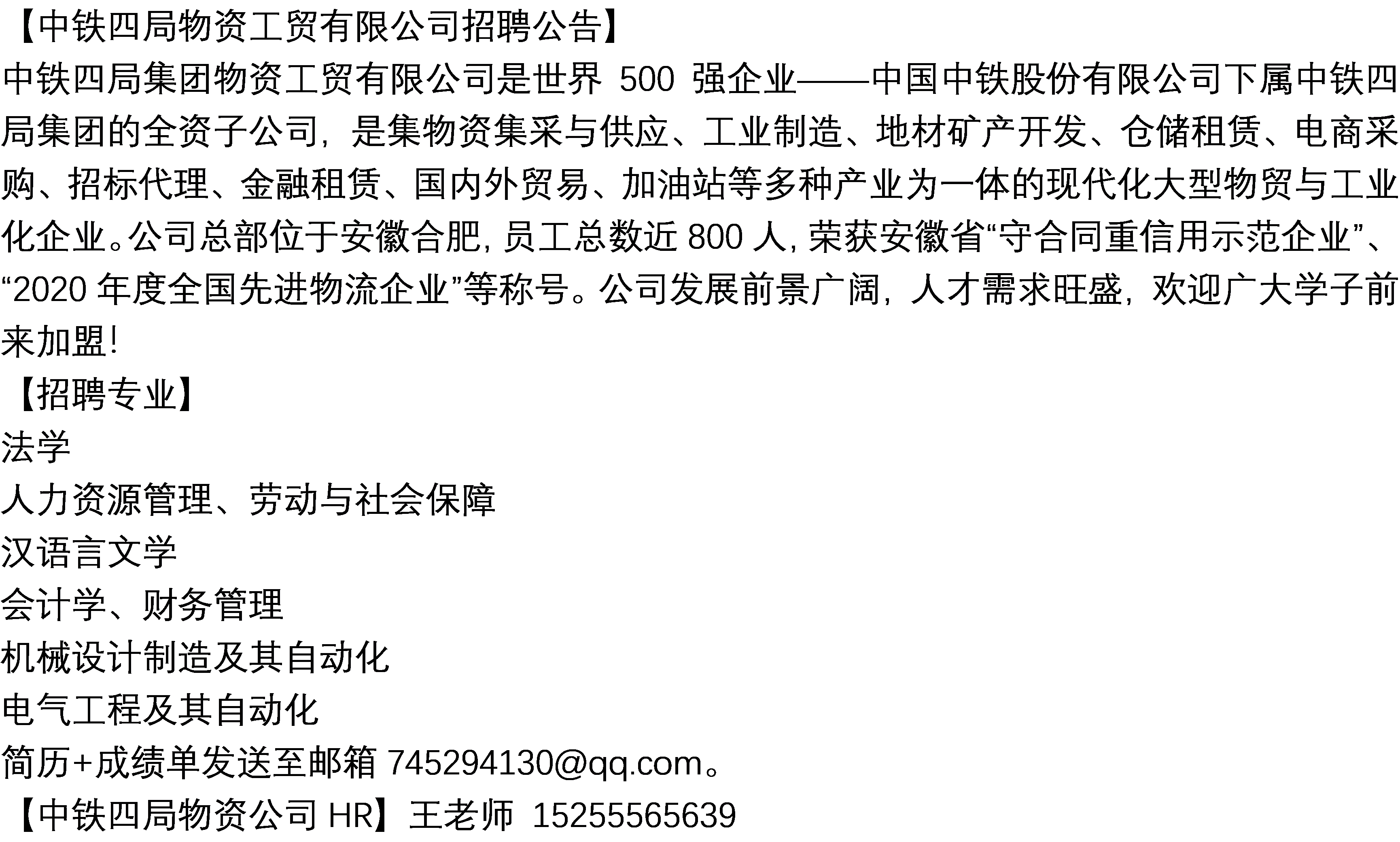 中铁四局物资工贸有限公司招聘公告